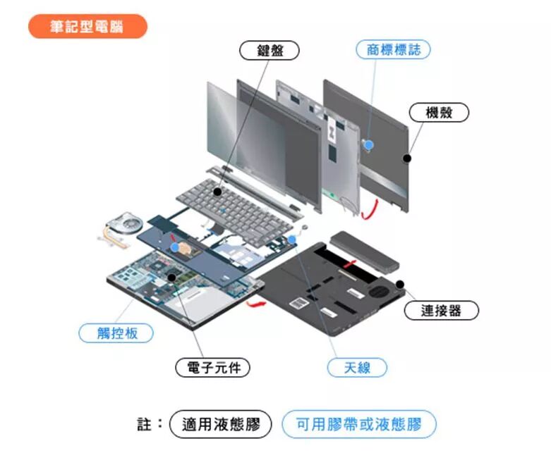 單/雙面膠帶因其加工與操作便利性而成為常用的輔助材料,但膠帶僅依靠物理現象所造成的黏著強度畢竟有限,所以在小面積卻需要高強度的接著就需要使用液態結構膠,電子產品最常用的液態結構膠為:雙液型結構膠(俗稱A/B膠)及濕氣反應型PU熱熔膠(簡稱PUR)。